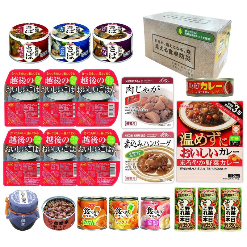 「金のいぶき」高機能玄米を使った吉野家の缶飯牛丼(温め不要でそのまま食べられる)に、3年保存のレトルトごはん、野菜350g分を使用した「カゴメ 野菜一日これ一本」、小豆島産生のりの佃煮、温めずにおいしいカレー各種、食べきりフルーツ、国内産さば缶などを組み合わせた、日常使いから非常時まで幅広く活躍する実用的な備蓄・常備セットです。
