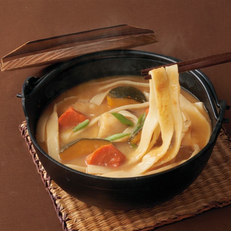山梨県の郷土料理ほうとう。茹でたかぼちゃや人参、ゴボウなどがセットされているので、煮込むだけでお手軽にお召し上がりいただけます。