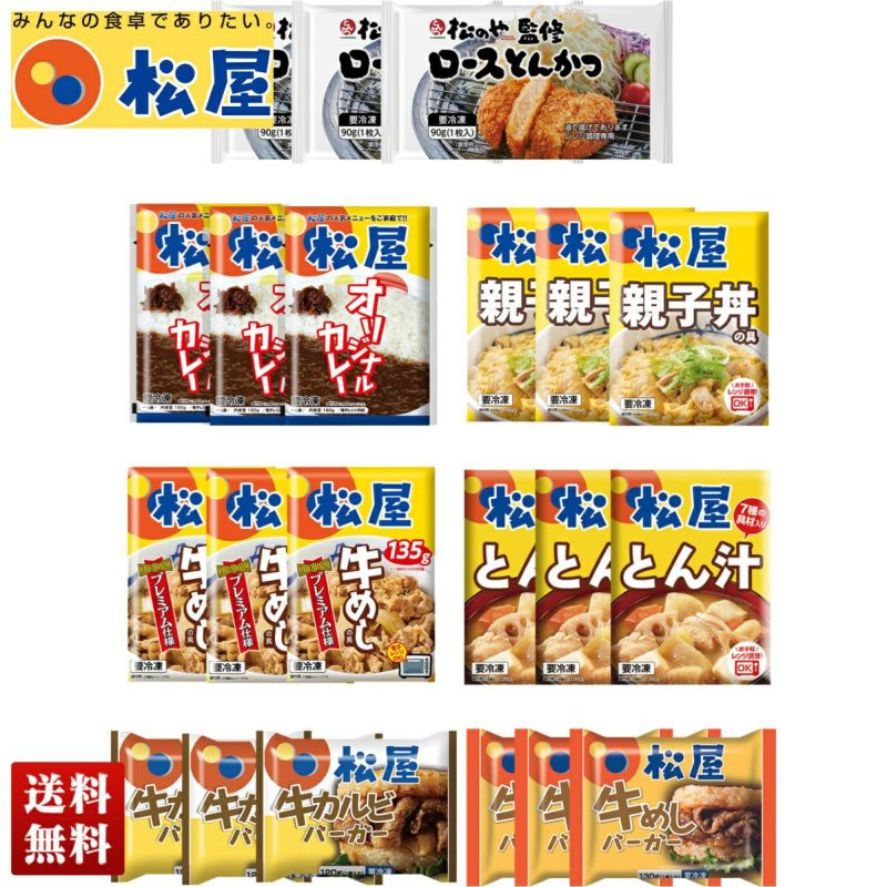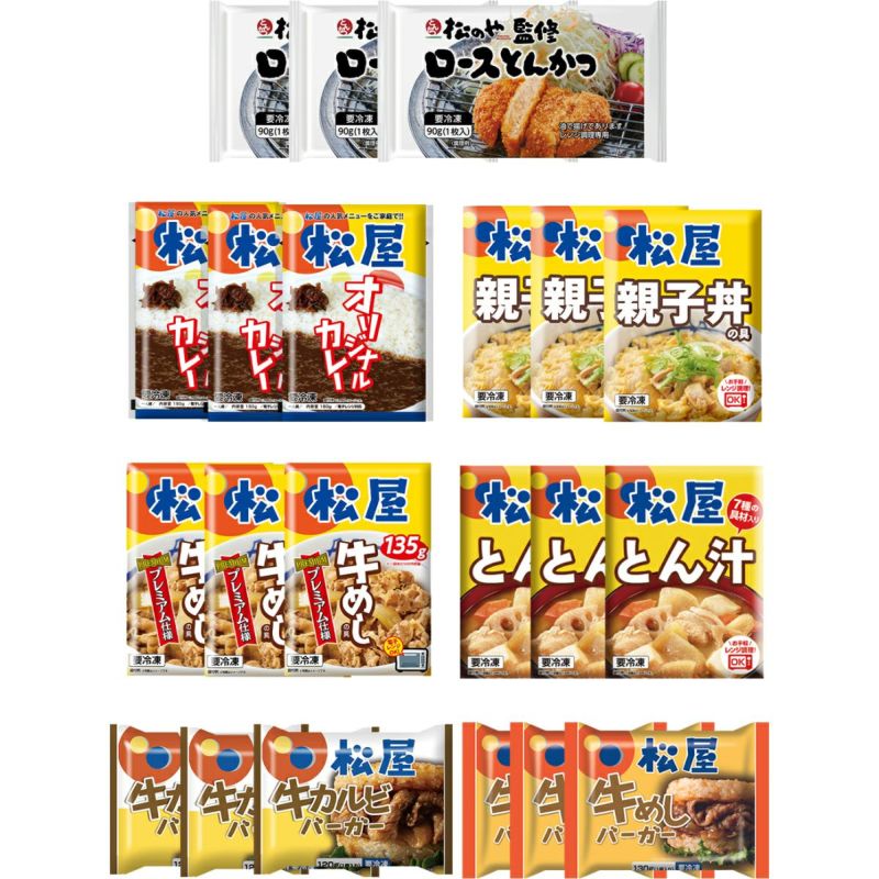 ■内容量:牛めしの具135g・カレー180g・親子丼の具135g・とん汁180g・ロースとんかつ90g×各3、ライスバーガー(牛カルビ120g・牛めし130g)×各3