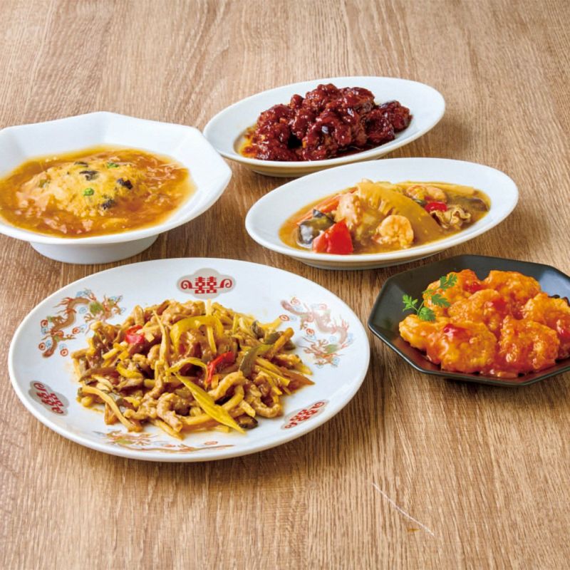 金華豚の青椒肉絲・金華豚の酢豚・海老のチリソース各150g、ふんわりかに玉185g、具だくさん八宝菜170g