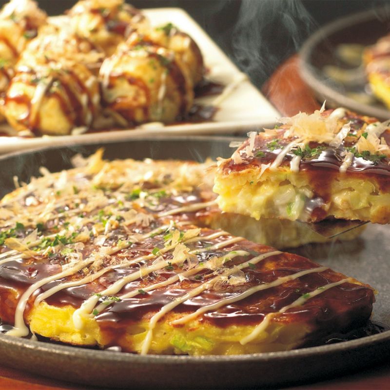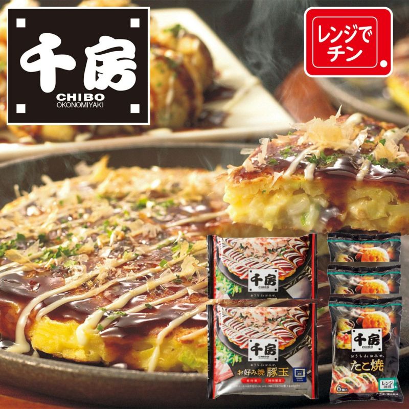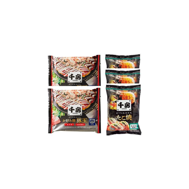 お好み焼豚玉220g×2、たこ焼(6個入)180g×3、濃厚ソース25g・ホワイトソース(マヨネーズ風味)10g×各5、かつお節1g・あおさ0.2g×各2