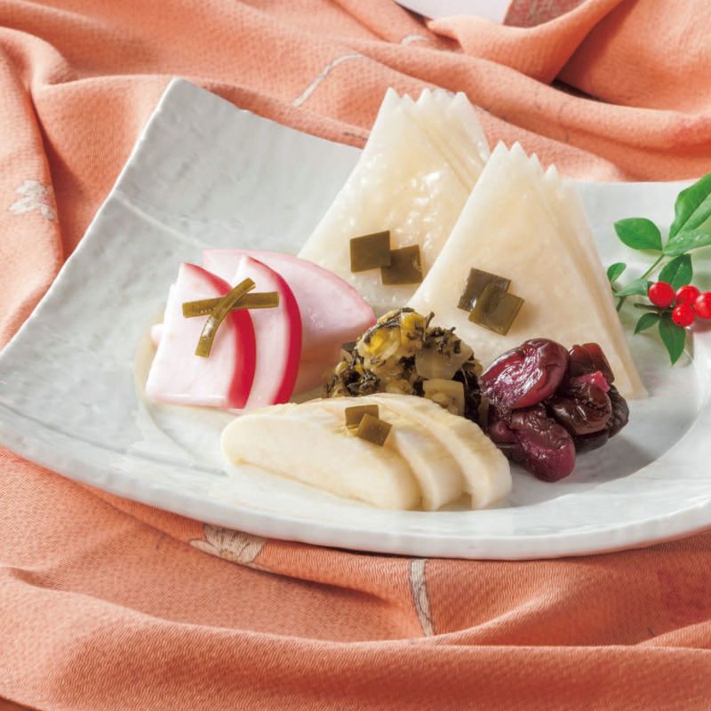 千枚漬70g、赤かぶら切漬62g、こぶ漬白菜132g、壬生菜漬・味すぐき・赤しそ胡瓜各40g