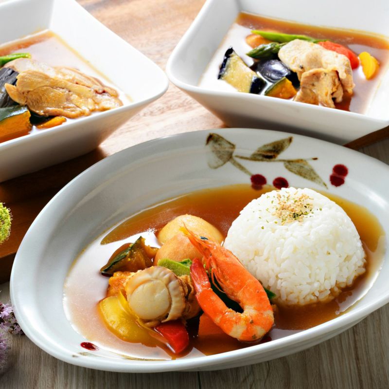 シーフードと鶏肉、豚肉をメインに、アスパラ、パプリカなど彩り豊かな6種類の野菜をトッピングしました。