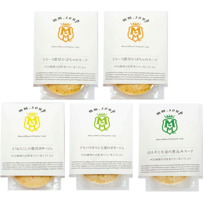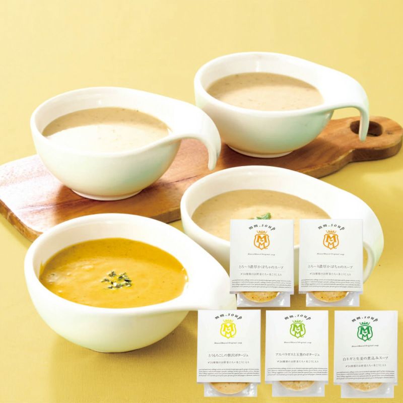 とろーり濃厚かぼちゃのスープ×2・とうもろこしの贅沢ポタージュ・アスパラガスと玉葱のポタージュ・白ネギと生姜の煮込みスープ各180g