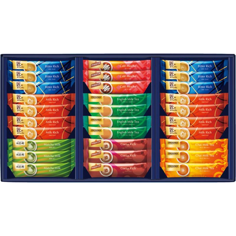 匠のカフェオレ(ミルクリッチ12.4g×8・ビターリッチ10.6g×6)、トワイニング(イングリッシュミルクティー14.9g×4・チャイミルクティー14.9g×3)、辻利抹茶ミルク17g×3、バンホーテン(ココアリッチ18g・カフェモカ15g)×各3