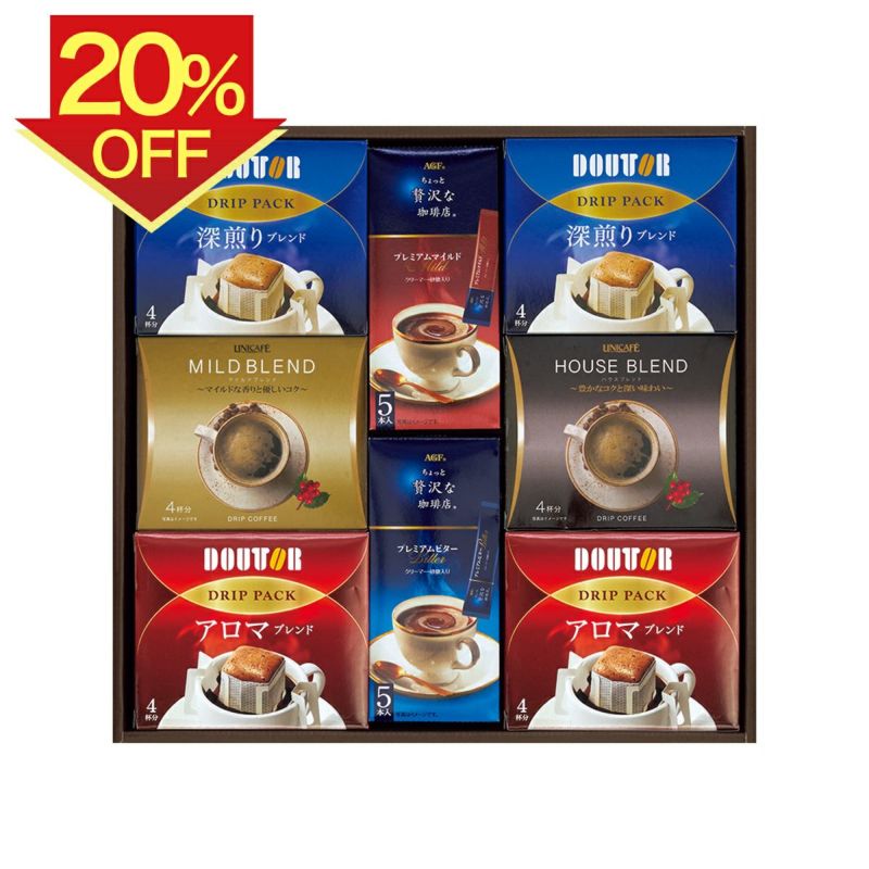 ドトールドリップパック(深煎りブレンド・アロマブレンド)各7g×各4P×各2、ちょっと贅沢な珈琲店スティックコーヒー(プレミアムマイルド・プレミアムビター)各7g×各5P、ユニカフェドリップコーヒー(ハウスブレンド・マイルドブレンド)各7g×各4P