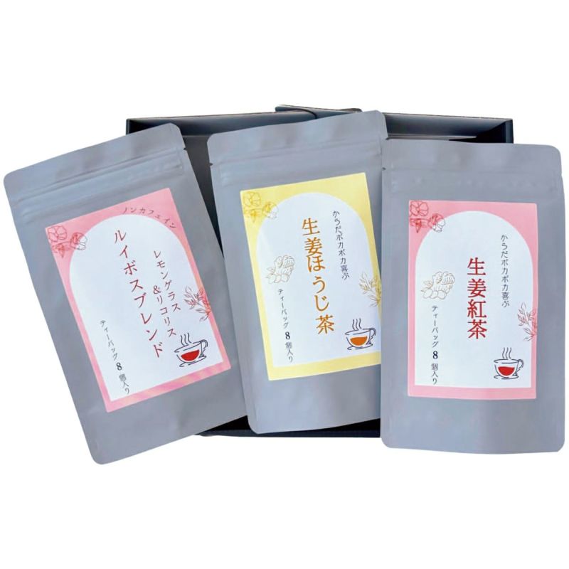 【こころもからだも温まる】ノンカフェインでミネラル豊富なルイボスティーに、爽やかなレモングラスとリコリスをブレンドしたフレーバーティーと、しょうがをブレンドしたほうじ茶と紅茶のティーバッグギフトです。