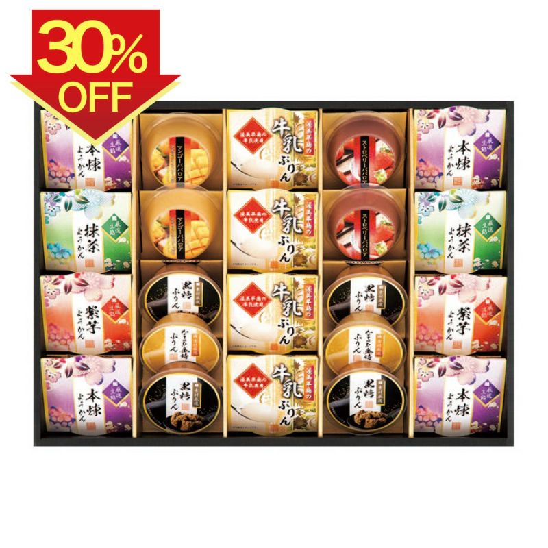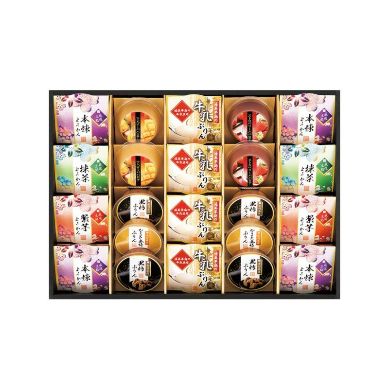 ぷりん(牛乳×4・黒糖×4・なると金時×2)各58g、カップデザート(マンゴーババロア・ストロベリーババロア)各56g×各2、カップようかん(本煉×4・抹茶×2・紫芋×2)各63g