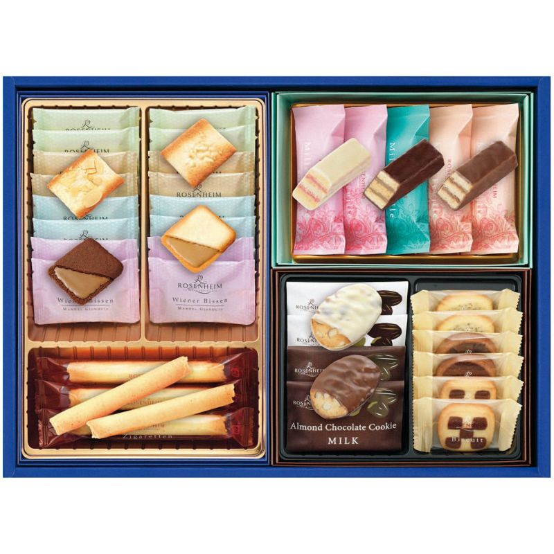 ミルフィーユ(ジャンドゥーヤ×2・ベリー×2・コーヒー)、ヴィーナービッセン(マカダミアナッツ・アーモンド・ヘーゼルジャンドゥーヤ・アーモンドジャンドゥーヤ)×各4、ツィガレッテン×4、アーモンドチョコレートクッキー(ミルク・ホワイト)×各2、ビスケット(チョコ&バター・チョコチップ・紅茶)×各2