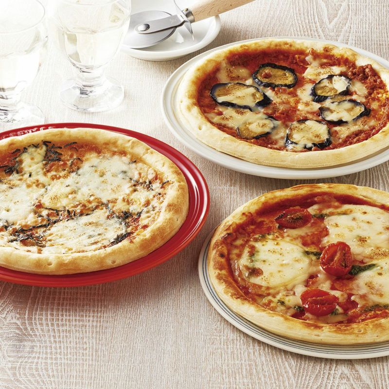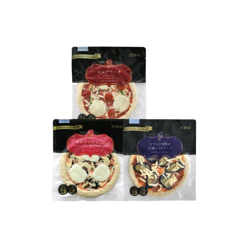 マルゲリータ205g、博多辛子明太子とフレッシュモッツァレラ173g、なすとひき肉の辛味トマトソース210g