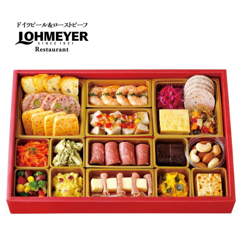 一段重、お重サイズ(外寸):縦214mm×横316mm×高さ48mm(内寸(1段)高さ:47mm)、(23品目)、(約4人前)【一の重】野菜とベーコンのケークサレ、モルタデラソーセージ、鶏肉と人参のテリーヌ、ポテトサラダ、カクテルシュリンプ、紫キャベツのラペ、ヴァイスブルスト、スペイン風オムレツ、きのこと野菜のマリネ、ローストポーク(カラフルマリネ添え)、キャロットラペ、蒸し鶏のバジル和え、ローストビーフ、ローストビーフソース、ショコラテリーヌ、ローストアーモンド、ローストカシューナッツ、ブロッコリーの彩りレモンサラダ、さつまいものサラダ、コールスローサラダ(キャベツ&コーン)、生ハム(ロース)、キューブチーズ、かぼちゃのサラダ、チーズケーキブリュレ