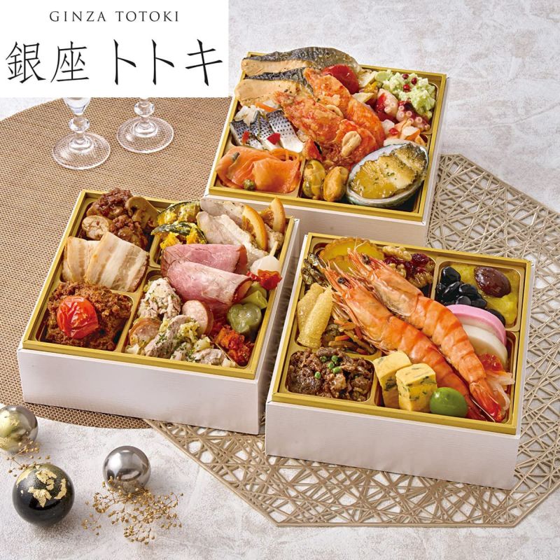 三段重、お重サイズ(外寸):縦165mm×横165mm×高さ183mm(内寸の高さ(1段)39mm)、(37品目)、(約2人前)【一の重】伊達巻、クランベリーくるみ、田作り、鳴門金時芋きんとん、渋皮栗甘露煮、北海道産黒豆、北海道産昆布の松前漬、数の子、雪降り和牛尾花沢のしぐれ煮、青実山椒、かまぼこ(赤)、かまぼこ(白)、焼き海老、紅白なます、いくら醤油漬、九条葱の玉子焼、若桃甘露煮 【二の重】若鶏の赤ワイン煮込、豚ばらチャーシュー、北海道産栗南瓜のサラダ、合鴨ロースト、オレンジコンフィ、ローストビーフ、バンデリージャ(ピクルス)、セミドライトマトのマリネ、豚肉のアルザス風煮込、赤ワイン風味のビーフシチュー、セミドライチェリートマト 【三の重】カラフトマスのレモンペッパー焼、セミドライチェリートマト、魚卵ずんだのマヨネーズ風味、たこのバジルソース、小肌かぶら漬、国産キャロットオニオンサラダ、スモークサーモン、ケーパー、ガーリックシュリンプ、華やか野菜マリネ、ムール貝スモーク、鮑のオリーブオイル仕立て