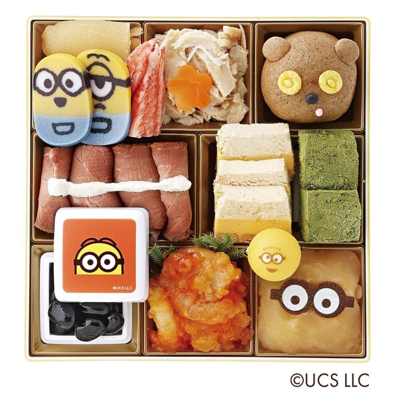 二段重、お重サイズ(外寸):縦165mm×横165mm×高さ105mm(内寸(1段):40mm)、(31品目)、(約3人前)【一の重】にしん昆布巻、焼海老、田作り、ふくませ麩(梅)、ボールチョコ(ミニオン)、蓮根柚子マリネ、味付小梅人参、ぶり照焼、青桃甘露煮、ミニオン万頭(ボブ)、市松羊羹、三色団子(ミニオン)、寿高野豆腐、椎茸旨煮、伊達巻、デミグラスハンバーグチーズ添え(フラッフィ)、イタリアンソーセージ、ブロッコリーのバジル和え、ドライトマトの赤ワイン煮 【二の重】味付数の子、カニ風味かまぼこ、かまぼこ(ミニオン)、サラダチキン、味付小梅人参、ミニオン万頭(ティム)、ローストビーフ(ヨーグルトソース)、キャラメルバナナチーズケーキ、わらび餅(抹茶)、ボールチョコ(ミニオン)、黒豆、エビチリ、鳴門金時芋きんとん、ゴーグルチョコ(ミニオン)