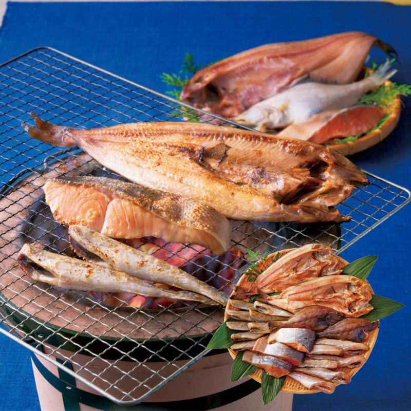 鮭うまみ干し切身80g×3、ほっけ一夜干し200g・宗八カレイ70g×各2、こまい一夜干し・姫たら各300g(北海道産原料を使用、北海道にて加工)