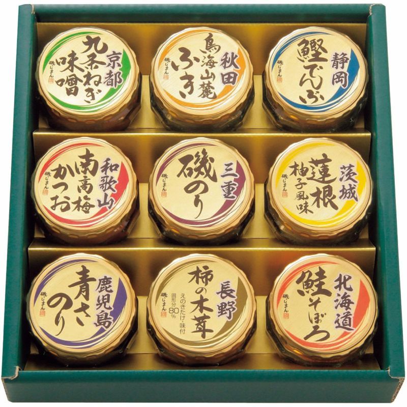京都九条ねぎ味噌・和歌山南高梅かつお・三重磯のり・鹿児島青さのり各90g、秋田鳥海山麓ふき・静岡鰹でんぶ各45g、茨城蓮根柚子風味55g、長野柿の木茸85g、北海道鮭そぼろ40g