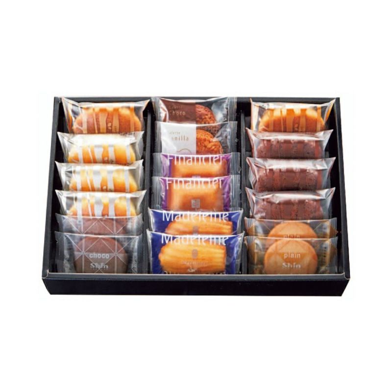 スフレ(フロマージュ・ショコラ)×各3、マドレーヌ、フィナンシェ、スフレキャラメル、サブレ(プレーン・チョコ)×各2、ガレット(バニラ・チョコ)