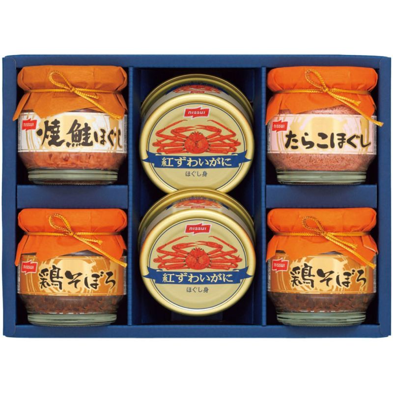 紅ずわいがにほぐし身55g×2、鶏そぼろ×2・焼鮭ほぐし・たらこほぐし各50g