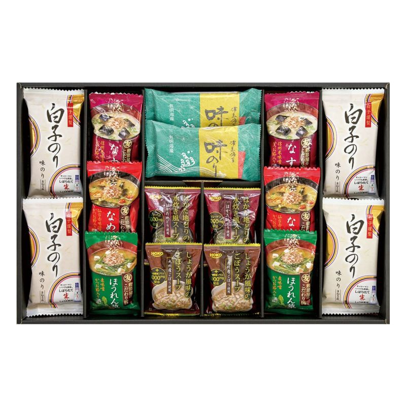 お湯を注ぐだけで本格的な味わいが楽しめる手軽さの即席椀物・スープと味海苔を詰合せたギフトです。