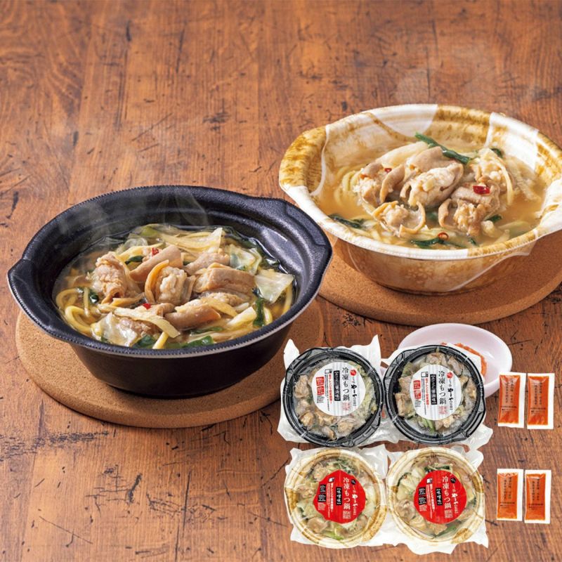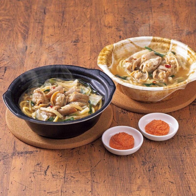 あごだし醤油味と味噌味の2種類にもつ肉、野菜、ちゃんぽん麺が入った電子レンジで簡単に楽しめるもつ鍋です。