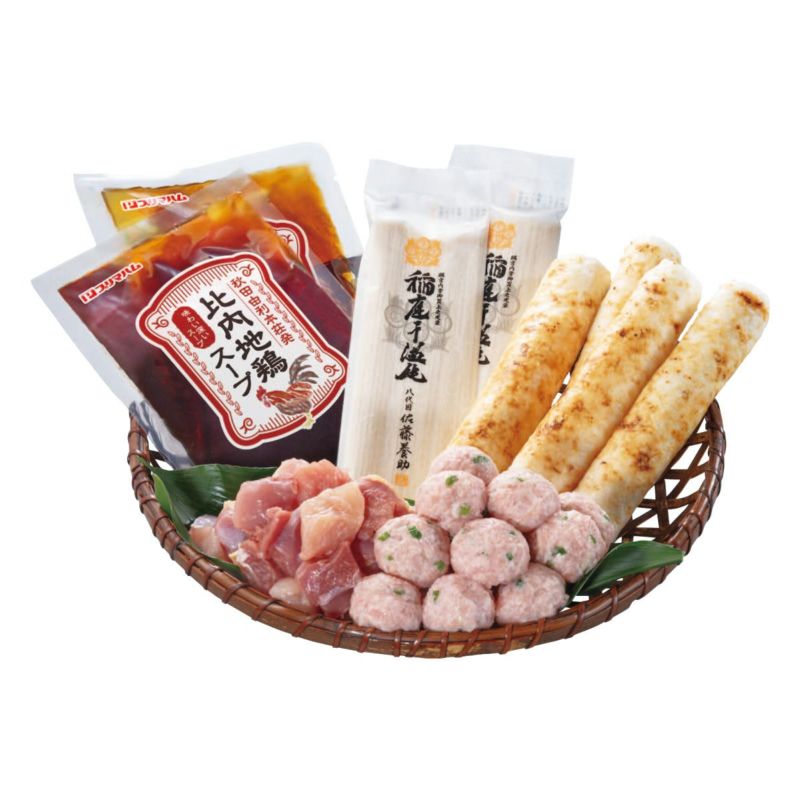 約3~4人前/比内地鶏200g、比内地鶏入り生つくね140g、きりたんぽ140g(2本入)・比内地鶏スープ(濃縮)200g・稲庭うどん(乾麺)80g×各2