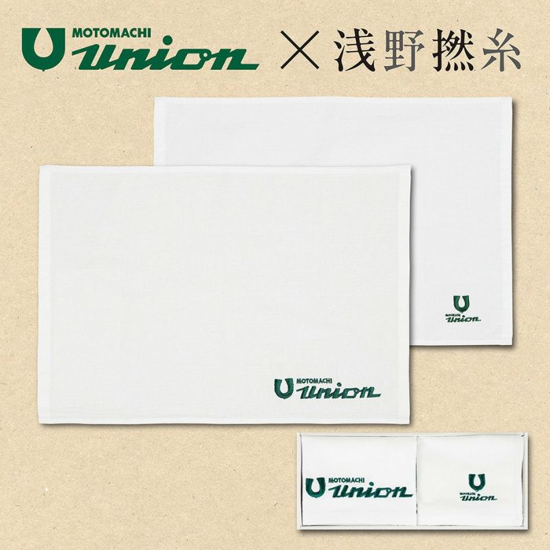 「もとまちユニオン」のロゴとカラーで仕上げたシンプルなデザインのキッチンクロスのセット。