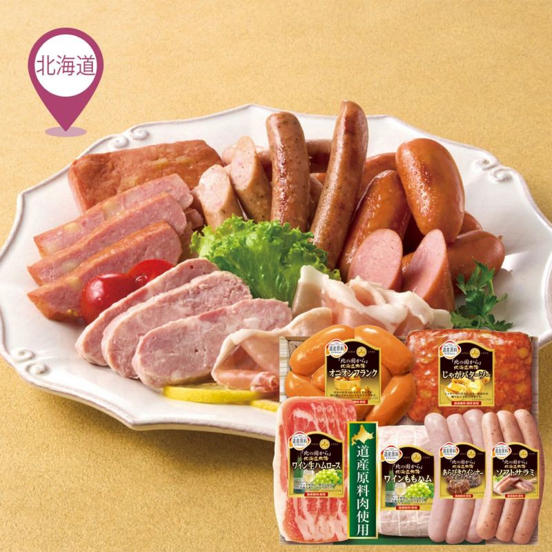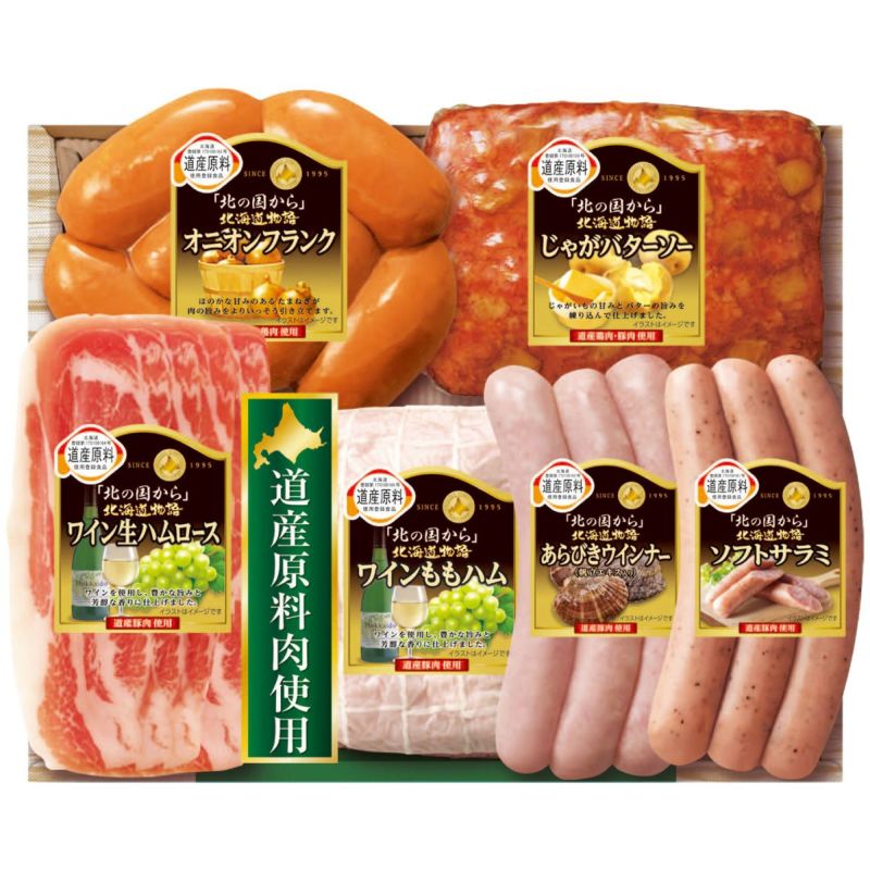 ワインももハム130g、ワイン生ハムロース35g、じゃがバターソー・オニオンフランク各180g、ソフトサラミ・あらびきウインナー(帆立エキス入り)各75g