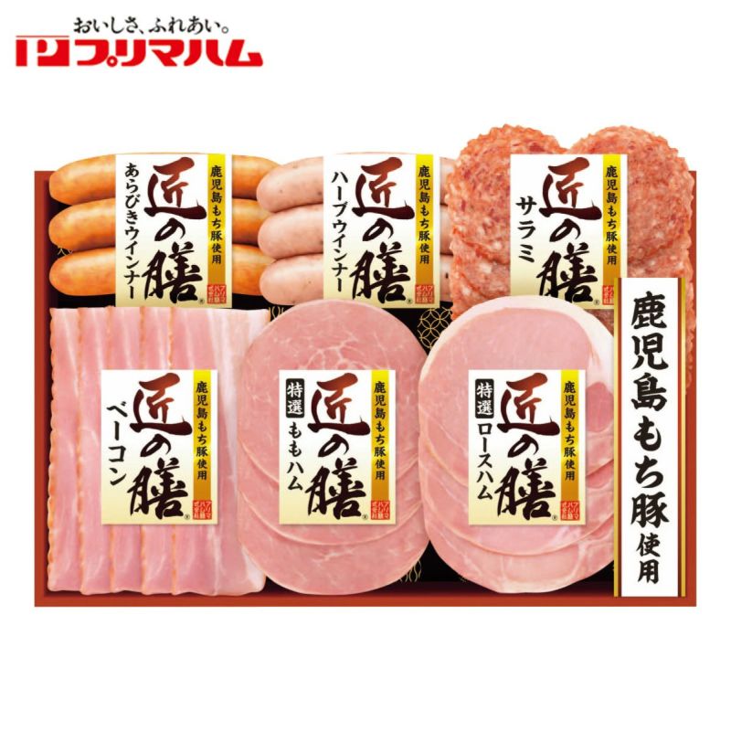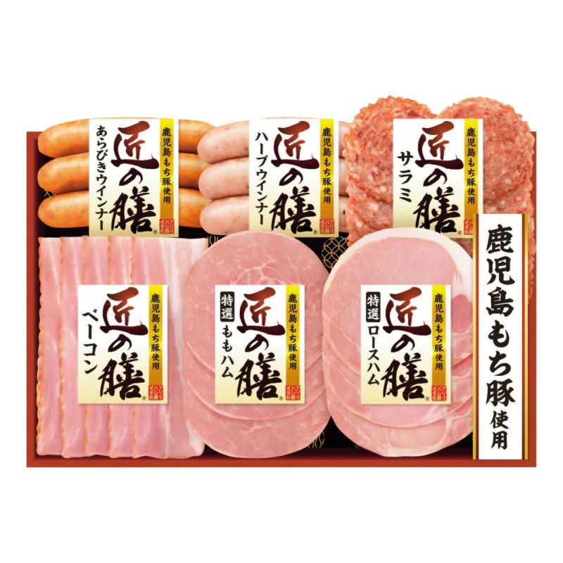 特選ロースハム・サラミ各36g、特選ももハム・ベーコン各40g、あらびきウインナー・ハーブウインナー各70g