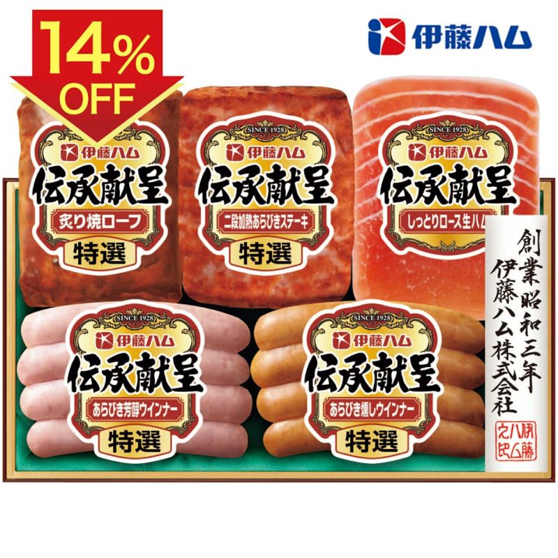 特選炙り焼ローフ160g、特選二段加熱あらびきステーキ110g、しっとりロース生ハム45g、特選あらびき燻しウインナー・特選あらびき芳醇ウインナー各80g