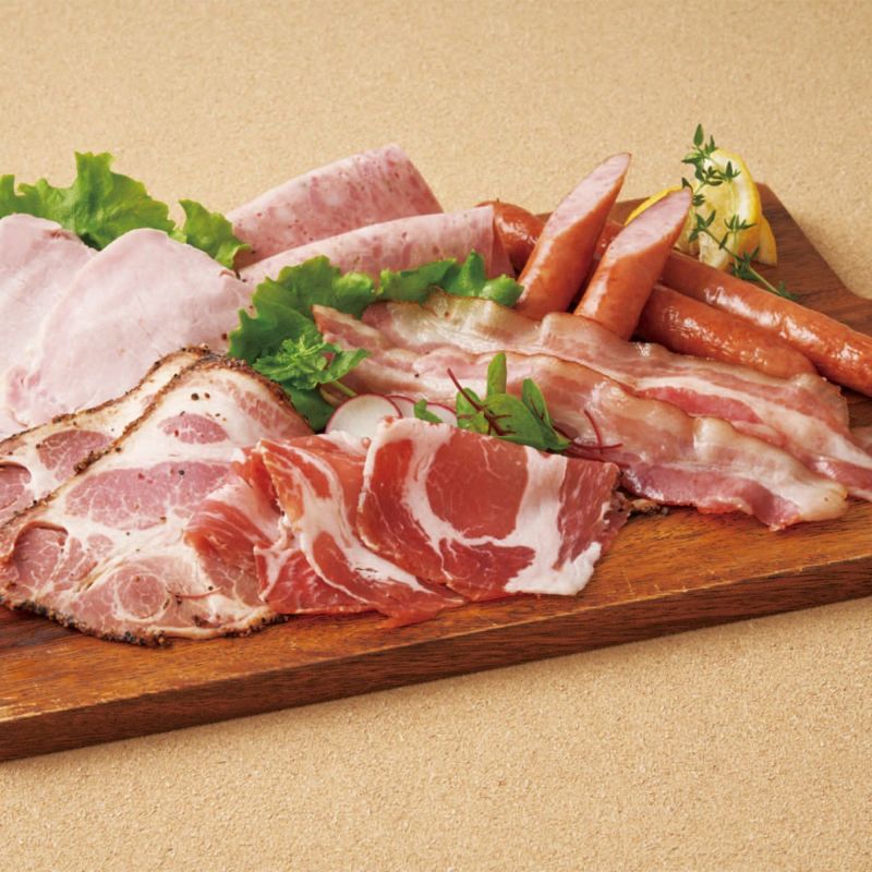 熟成乾塩ベーコン80g、生ハム(肩ロース)40g、カントリーロースト・ペッパーシンケン各72g、チーズリヨナー36g、あらびきポークウインナー120g
