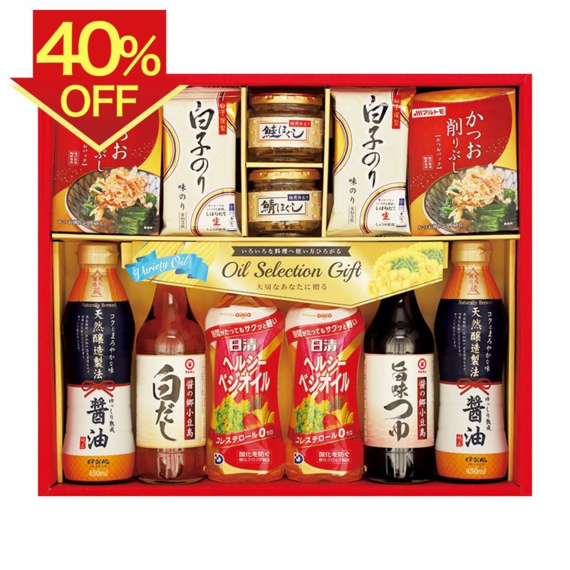 マルキン(旨味つゆ・白だし)各360ml、日清ヘルシーベジオイル350g×2、伊賀越天然醸造醤油450ml×2、白子味のり(8切5枚)×4、マルトモかつお削りぶし1.5g×4P×2、鮭ほぐし40g、鯖ほぐし40g