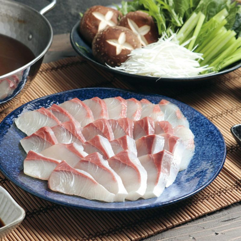 大分県のブランド魚かぼすブリをしゃぶしゃぶ用に薄引きにしてオリジナルの魚介だしたっぷりの和風スープをベースにした鍋セットにしました。