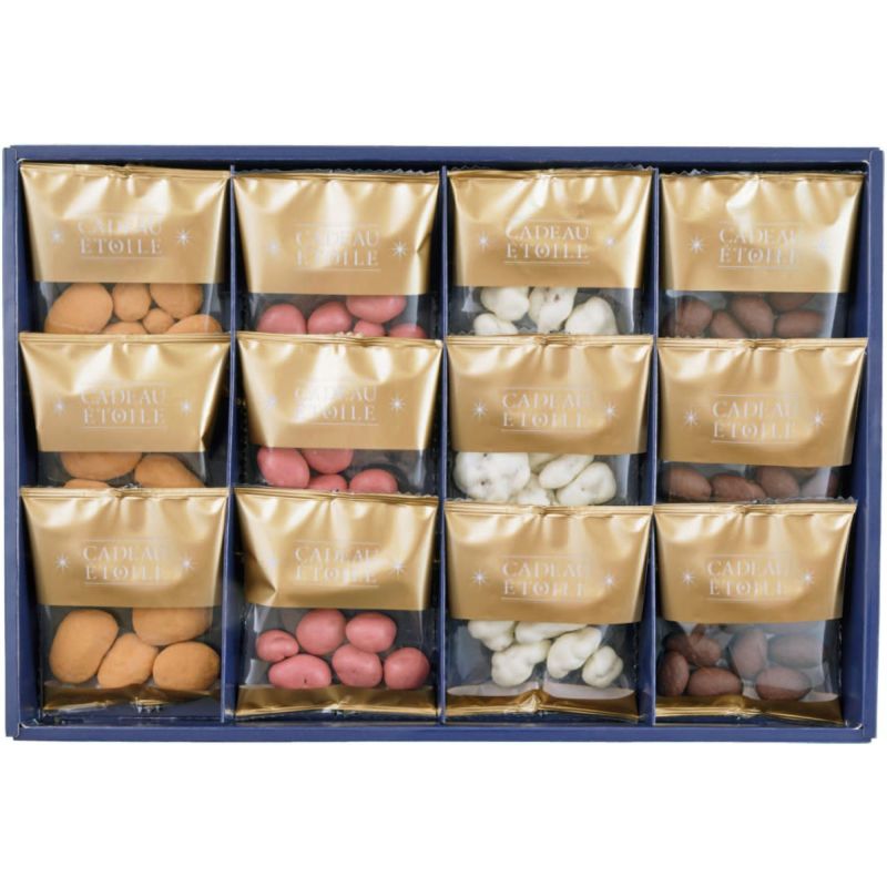 クルミ(ホワイトチョコレート)・アーモンド(ミルクチョコココア)・クランベリー(いちごチョコレート)・ピーカンナッツ(キャラメルチョコレート)×各3