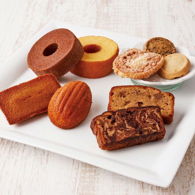 フィナンシェ、はちみつマドレーヌ、マーブルケーク、マロンケーク、パルミエ・バームクーヘン(プレーン・ショコラ)×各2、クッキー(黒胡麻と黒糖・バニラ)×各5