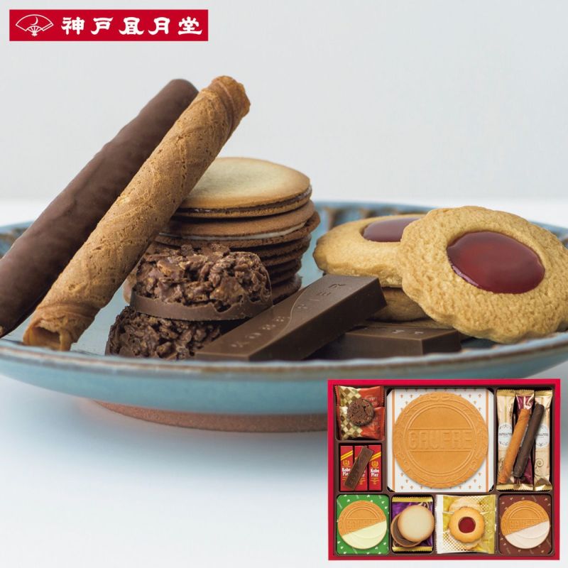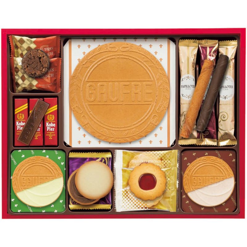 ゴーフル3枚(バニラ・ストロベリー風味・チョコレート)、ゴーフルオグーテ(抹茶)2枚、プティーゴーフルオグーテ(抹茶×3枚・紅茶×3枚)、パレオショコラ・パピヨット×各4、チョコレートパピヨット・ジャムトップクッキー・ゴーフルクランチ×各2、コウベピアー×3
