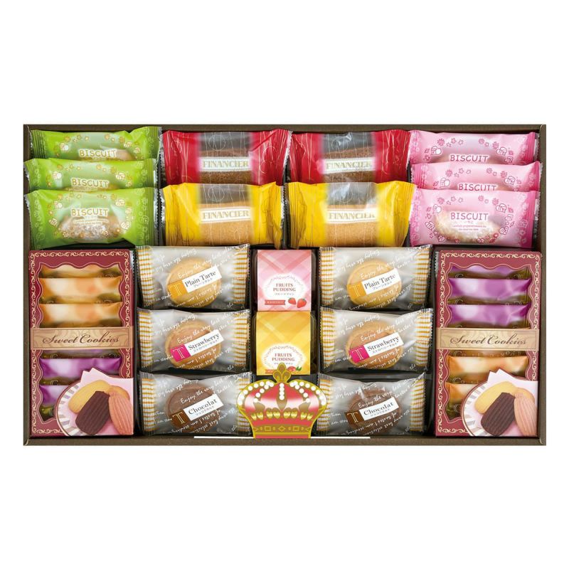 クッキー(ココア×6・ストロベリー×3・マンゴー×3)、タルト(プレーン・ショコラ・ストロベリー)×各2、フィナンシェ(プレーン・ショコラ)×各2、ビスキュイ(マンゴー・いちご)×各3、フルーツプリン(ストロベリー・マンゴー)各57g