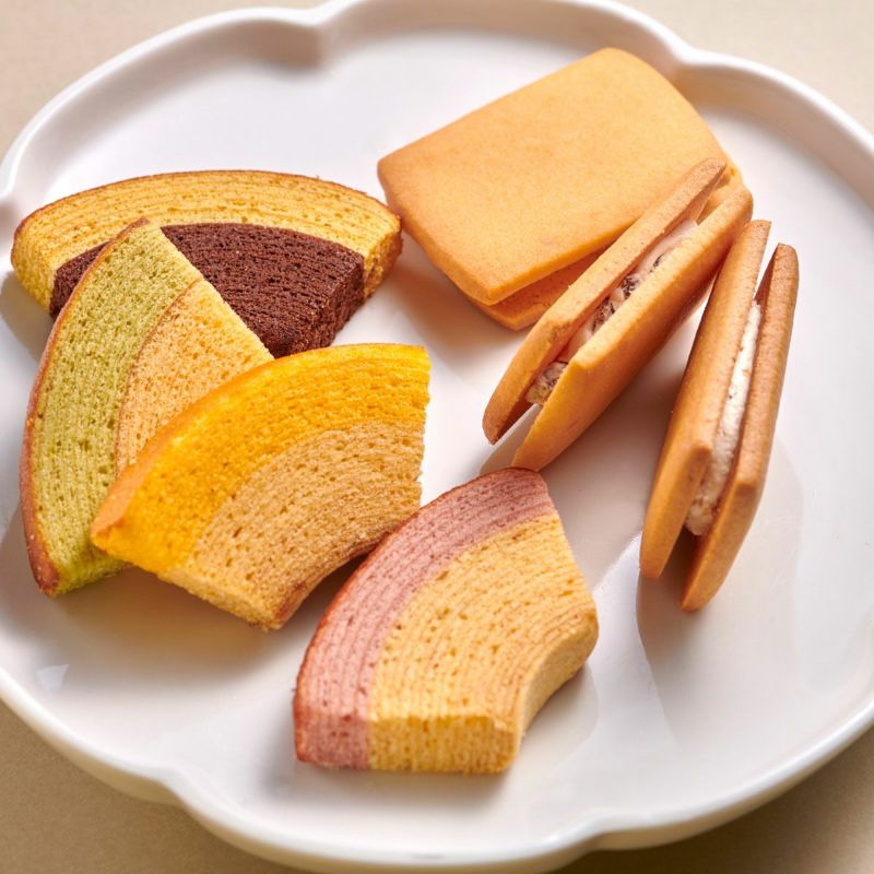 一層一層丁寧に焼き上げた生地と、果汁を加えて仕上げた生地の2つの味が絶妙なハーモニーの「フルーツクーヘン」。なめらかで口当たりのやさしいフルーツクリームと香り豊かな果肉を香ばしいクッキーでサンドした「フルーツサンド」の詰合せです。