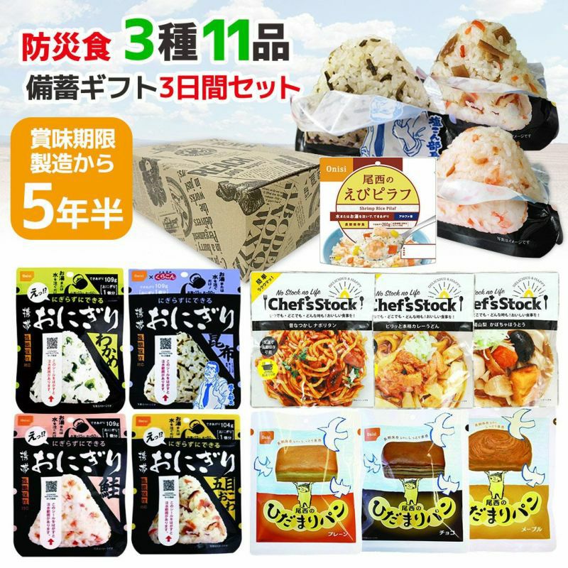 Chef'sStockの「昔なつかしナポリタン」と「ピリッと本格カレーうどん」に、尾西のわかめごはん・えびピラフ、携帯おにぎり(鮭/わかめ/五目おこわ/昆布)を詰め合わせました。毎日の食事はもちろん、備蓄用にも便利です。