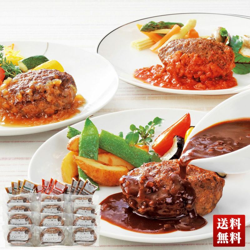 お肉の旨みがぎゅーっと詰まったハンバーグ12食+3種のソース付き。牛肉7:豚肉3の黄金比で配合。真空調理でうま味を閉じ込めた、人気のハンバーグ。
