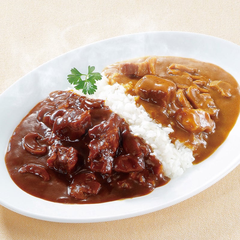 スライスマッシュルームとやわらかビーフが入った新宿中村屋の贅沢な2種類のカレーセット。コク深いデミグラスソースと特製ブレンドスパイスが調和した芳醇でリッチな香りが楽しめるカレーと、じっくり炒めた香味野菜の甘みとクリーミーなコクが調和した濃厚でリッチな味わいのカレーです。