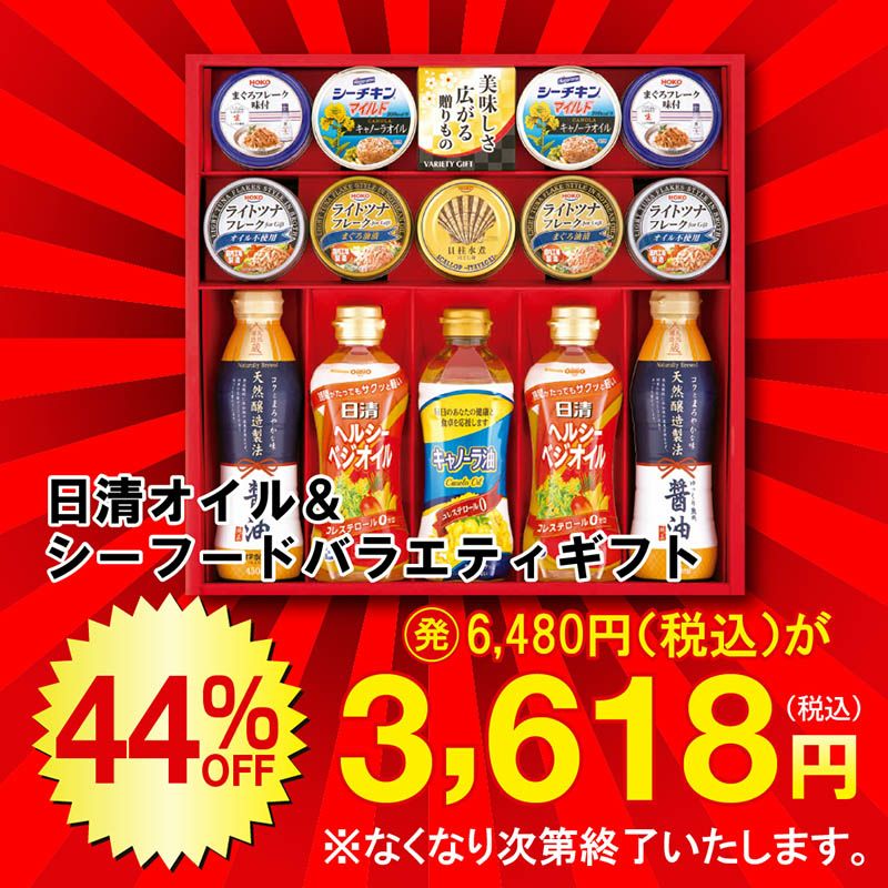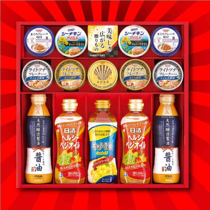 日清ヘルシーベジオイル350g×2、キャノーラ油350g、はごろもシーチキンマイルドキャノーラ70g×2、宝幸(まぐろフレーク味付70g×2・ライトツナフレークまぐろ油漬70g×2・ライトツナフレークオイル不使用70g×2・貝柱水煮ほぐし身65g)、伊賀越天然醸造醤油450ml×2
