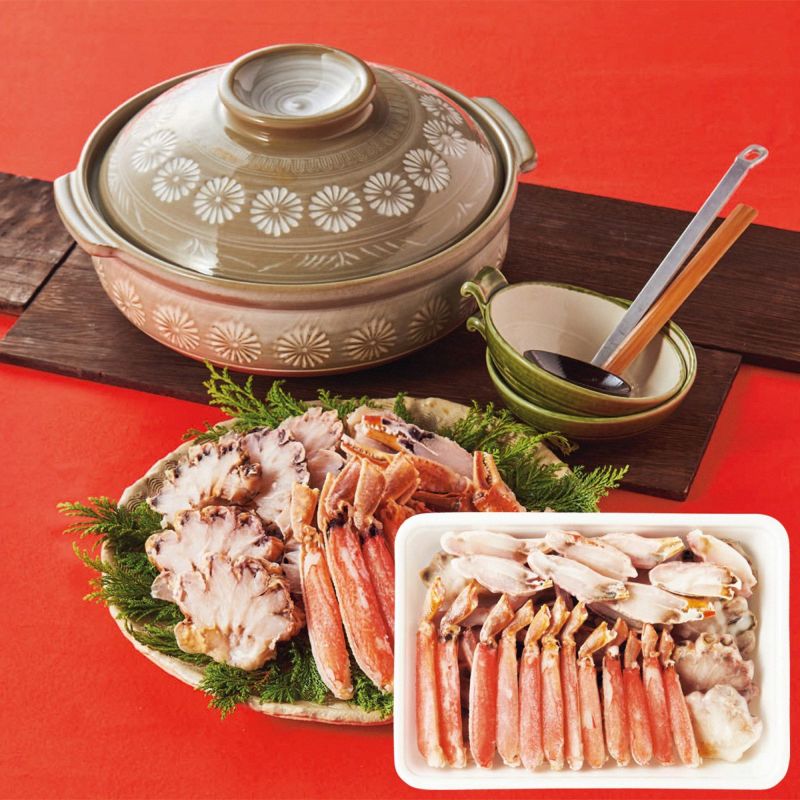 贅沢に蟹鍋を楽しめるように、生のずわい蟹を4つの部位に食べやすく半むき身にしました。