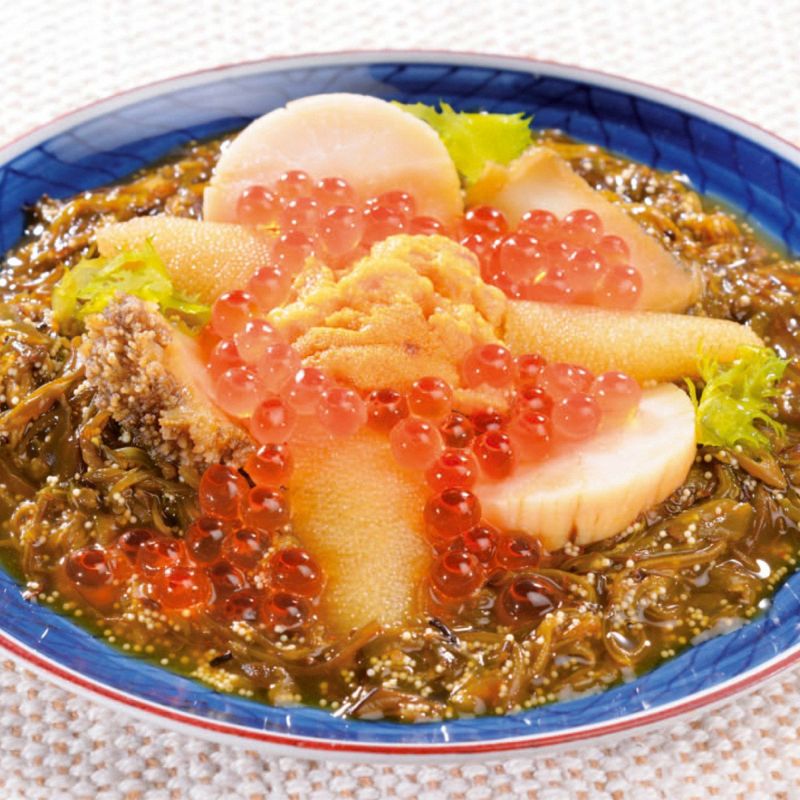 いくら、ほたて、数の子、あわび、うになど、海のお宝が一堂に会した海の宝石箱と言える一品です。