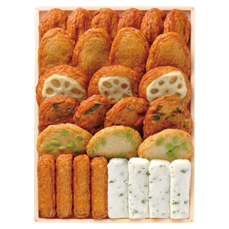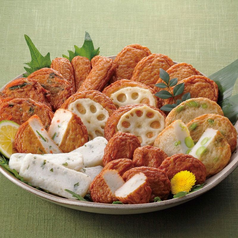 ごぼう天18g×6枚、上揚30g×4枚、れんこん揚45g×3枚、野菜天30g×4枚、枝豆天30g×3枚、棒天20g×4本、しそ棒天20g×4本
