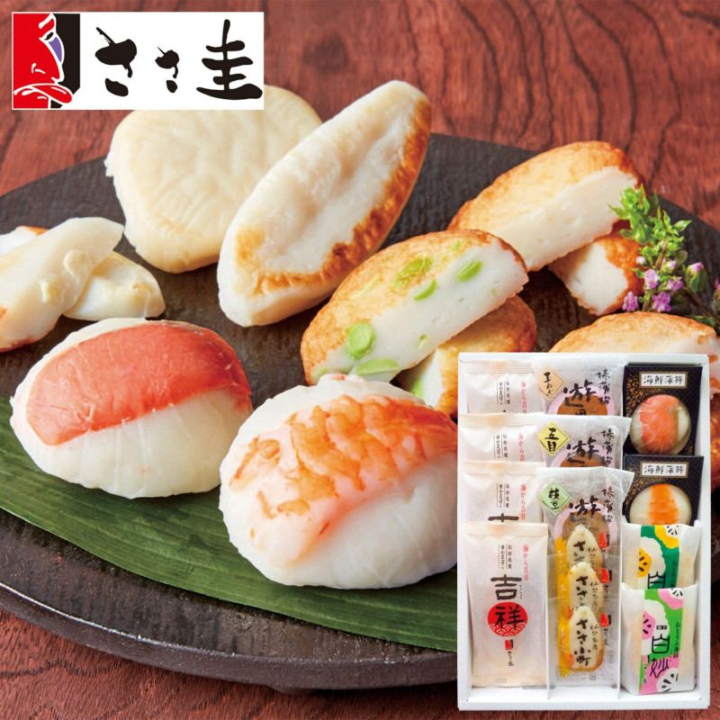 上質なすり身を使用し、きめ細やかな食感と魚本来の味を引き出した笹かまぼこ吉祥をはじめ、「ささ圭」自慢のオリジナル蒲鉾の詰合せです。