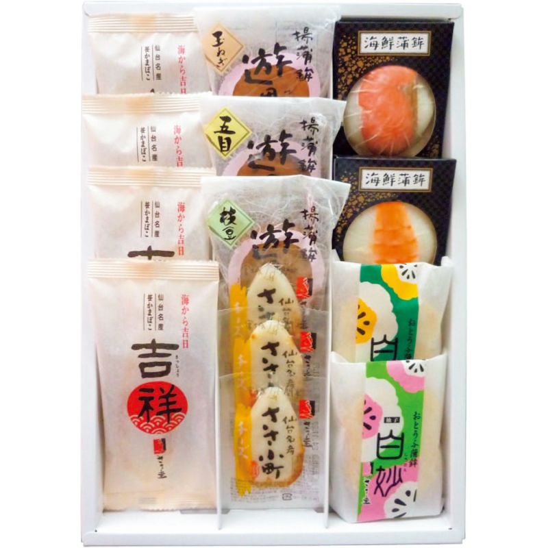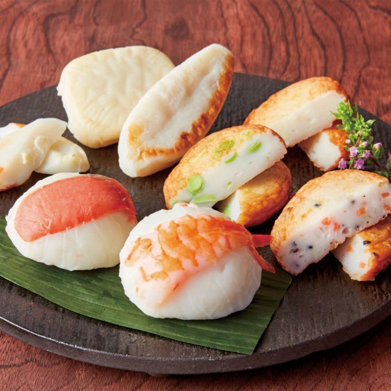 笹かまぼこ35g×4、真空笹かまぼこ(チーズ)20g×3、揚げ蒲鉾(枝豆・五目・玉ねぎ)各40g、おとうふ蒲鉾(柚子・プレーン)各50g、海鮮蒲鉾(えび・紅鮭)各50g
